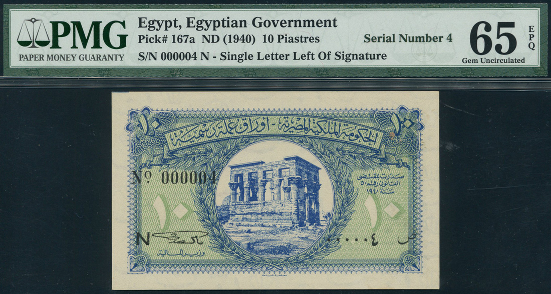 (x) Egyptian Government Currency Note, 10 piastres, ND (1940), serial number 000004, blue on green underprint, Temple of Philae at centre, value at left and right and each corner, reverse green and pink, value at low left and right, Kamel Sedky