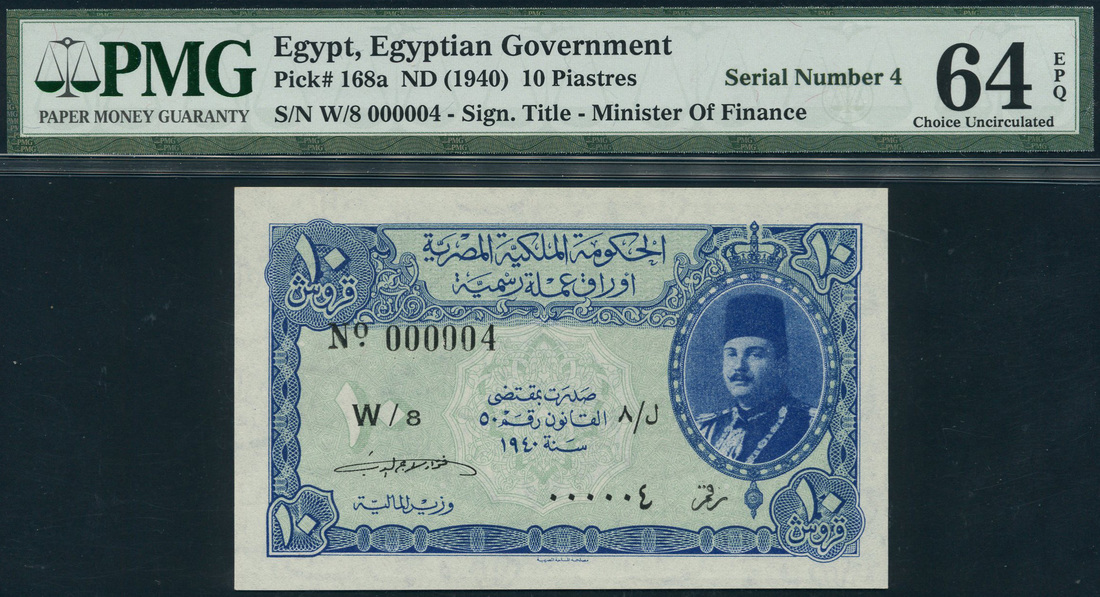 (x) Egyptian Government Currency Note, 10 piastres, 1940, serial number W/8 000004, blue on green underprint, King Farouk at right, value at each corner, reverse green and pink, value at each corner, Fouad Seragiddine signature