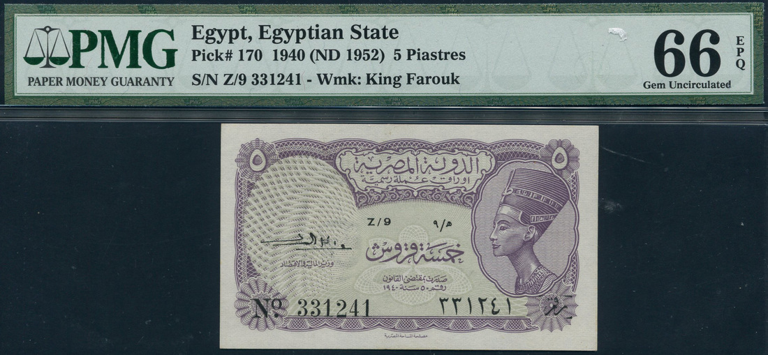 (Pick 170), King Farouk watermark at left, in PMG holder number 66 EPQ, gem uncirculated, scarce in this high grade
