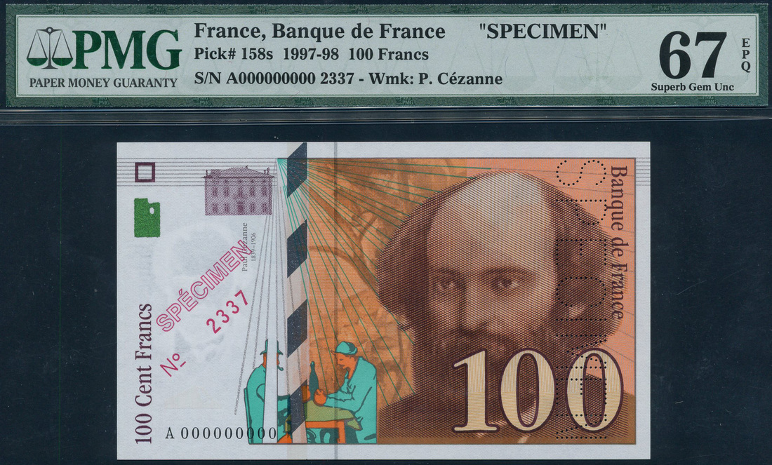 (x) Banque de France, specimen 100 francs, 1997, serial number A000000000, orange and multicolour, Paul Cezanne at right, reverse painting, perforated and with SPECIMEN,