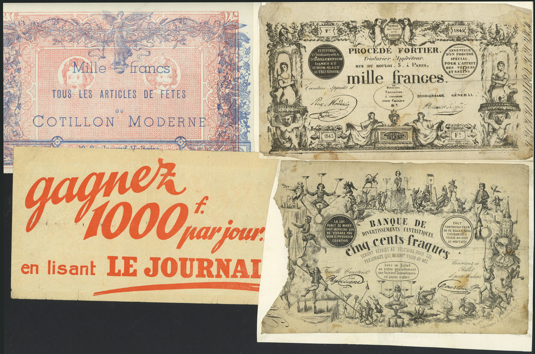 French skit notes, Banque de Divertissements Fatastiques, 500 fraques, a facsimile Banque de France 1000 francs, 1000 francs 'Tous les articles de fetes', Procede Fortier 1000 francs,