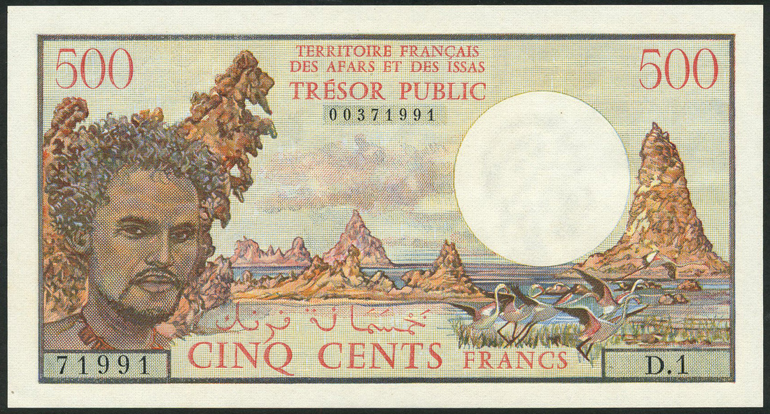 Trésor Public Territoire Francais de Afars et des Issas, 500 francs, ND (1975), serial number D.1 71991, multicolour, man at left, flamingos at right, reverse, two painted sailing boats