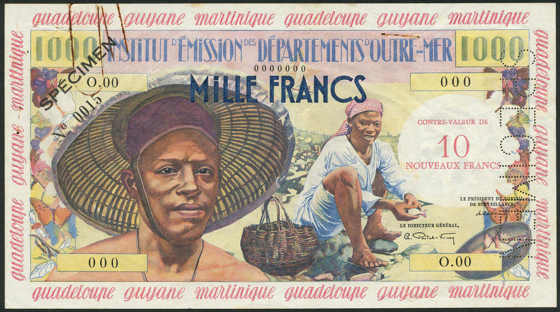 Institut d'Emission des Departements d'Outre-Mer, French Antilles, specimen 10 NF on 1000 francs, ND (1960), zero serial numbers, multicoloured, fisherman at left, red CONTRE-VALEUR DE 10 NOUVEAUX FRANCS at right, constituent states in red around margins, Postel-Vinay and Calvert signatures, reverse multicoloured, banana plant, woman and tray of bananas
