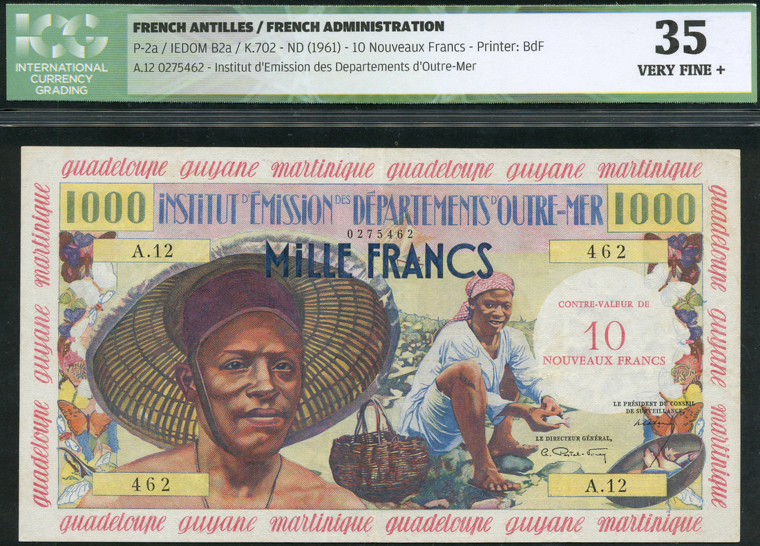 (x) Institut d'Emission des Departements d'Outre-Mer, French Antilles, 10NF on 1000 francs, 'Pecheur', ND (1960), serial numbers A.12 462, blue and multicoloured, fishermen, Postel-Vinay and Calvet signatures, red guadeloupe guyane martinique in red in borders around, red overstamp 'CONTRE-VALEUR DE 10 NOUVEAUX FRANCS' at right, reverse multicoloured, woman with basket of fruit, banana tree at right