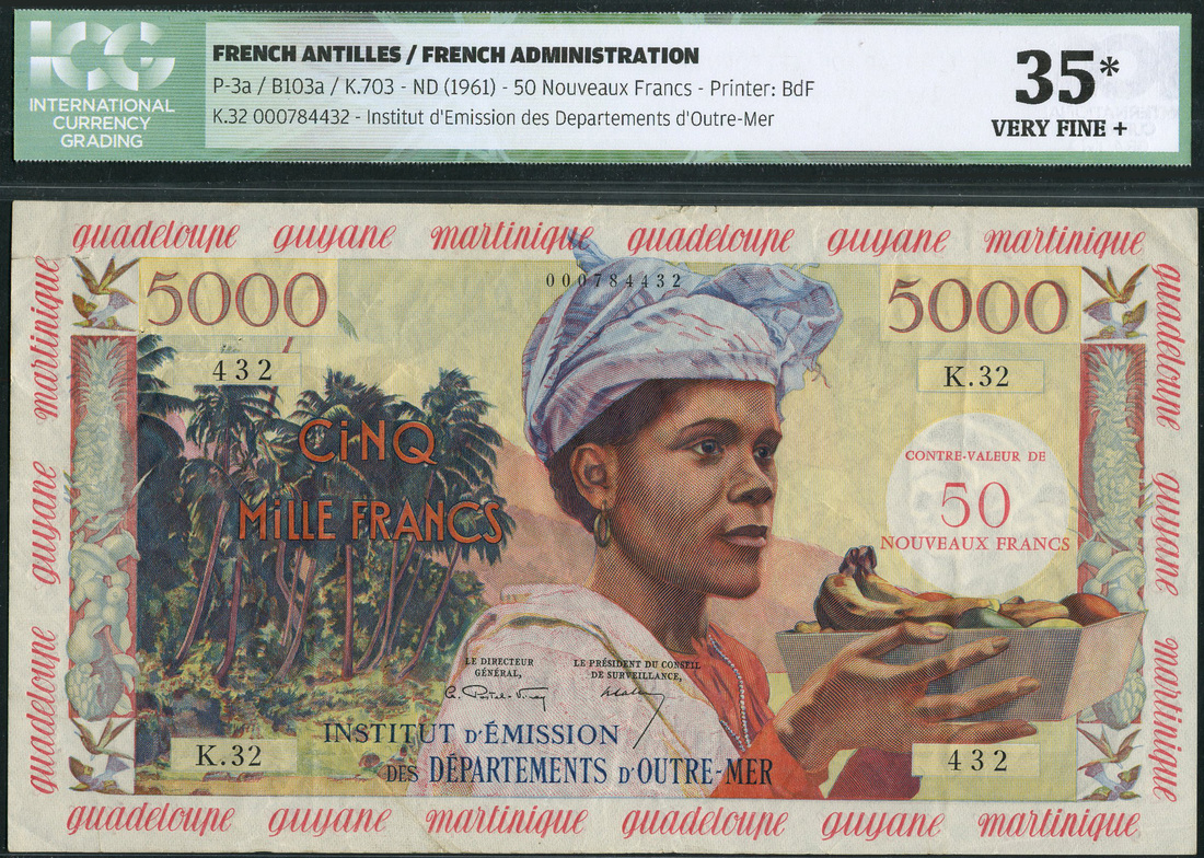 (x) Institute d'Emission des Departments d'Outre-Mer, French Antilles, 50NF on 5000 francs, ND (1961), serial number K.32 432, multicoloured, woman holding fruit bowl at centre and right, red Guadeloupe Guyane Martinique in margins, red CONTRE-VALEUR 50 NOUVEAUX FRANCS at right, Postel-Vinay and Calvet signatures, reverse woman cooking at left, sugar-cane harvesting in background