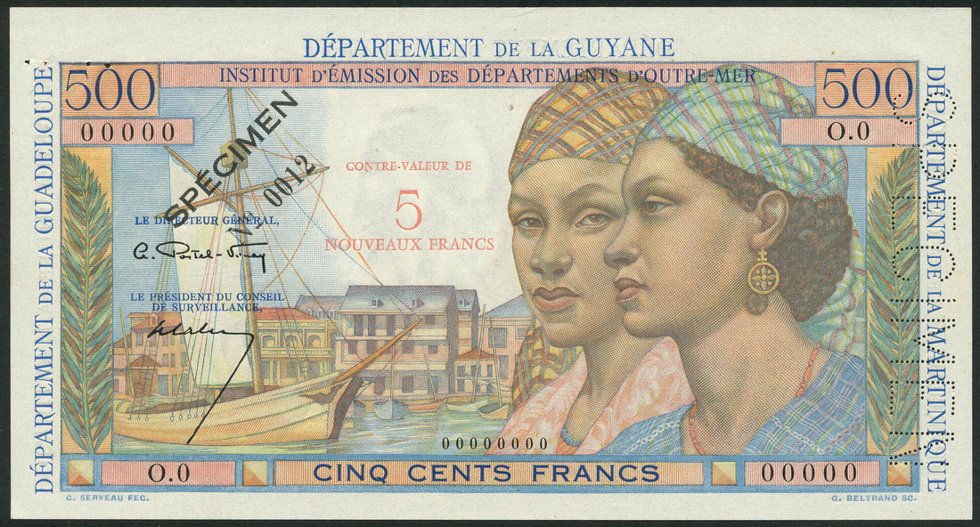Institut d'Emission des Departements d'Outre-Mer, French Antilles, specimen 5 NF on 500 francs, ND (1962), zero serial numbers, multicoloured, two women and the port of Pointe-a Pitre, red CONTRE-VALEUR DE 5 NOUVEAUX FRANCS at right, constituent states in blue around margins, Postel-Vinay and Calvert signatures, reverse multicoloured, bullock carts and sugar cane