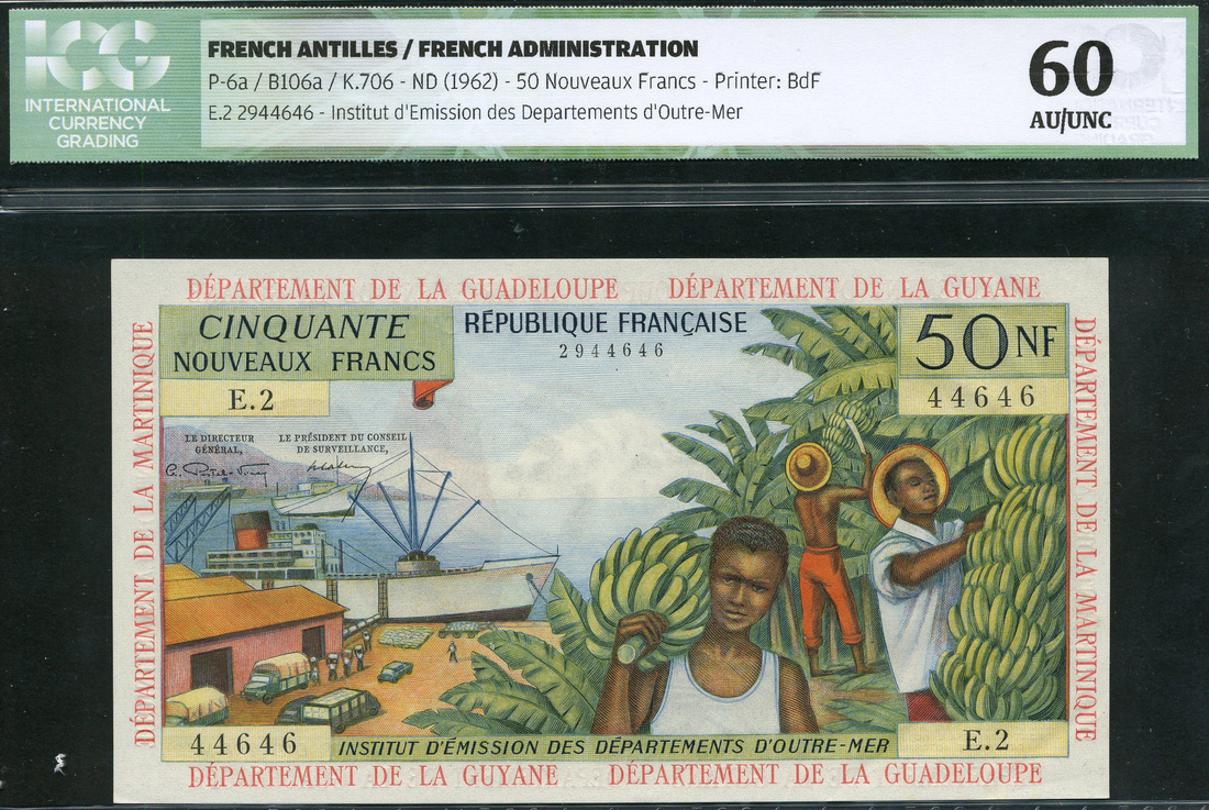 (x) Institut d'Emission des Departements d'Outre-Mer, French Antilles, 50 nouveaux francs, ND (1962), serial number E.2 44646, blue and multicoloured, banana harvesting and dock loading in field, Postel-Vinay and Calvet signatures, red DEPARTEMENT DE LA MARTINIQUE/GUADELOUPE/GUYANE in borders, reverse multicoloured, allegorical couple and coastline in field
