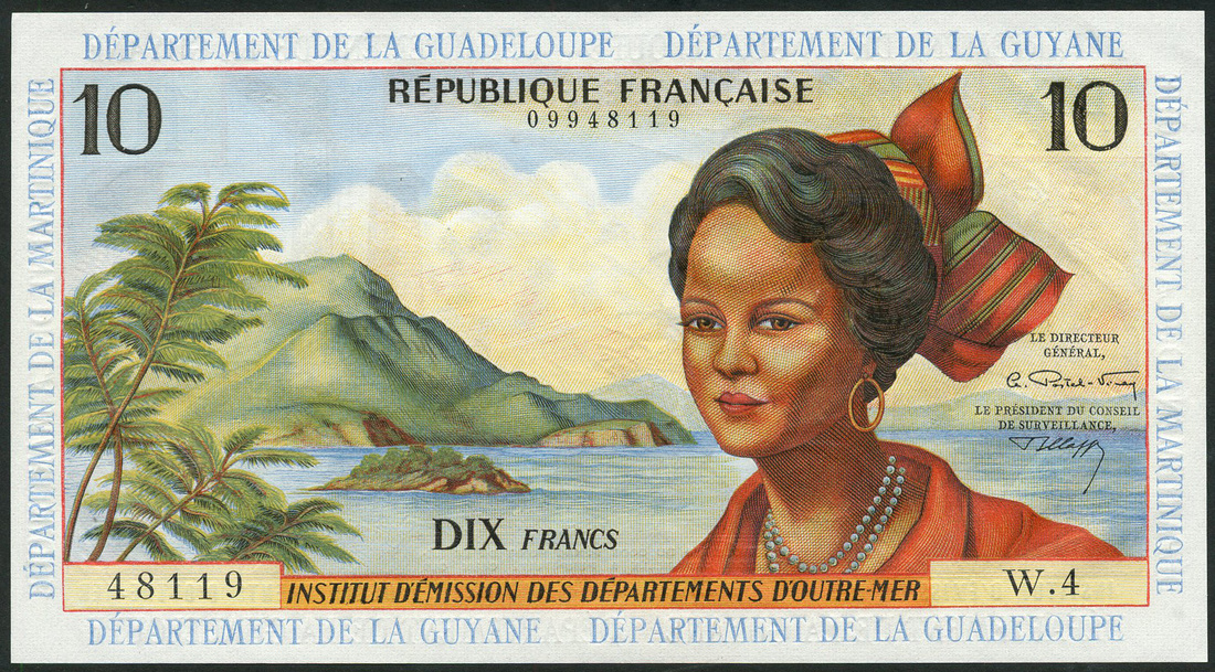 Institut d'Emission des Departements d'Outre-Mer, French Antilles, 10 Francs, 1964 (ND), serial numbers W.4 48119-20 brown and green on multicoloured underprint, young woman in headdress at right, reverse cutting sugar cane, Postel Vinay and Clappier signatures