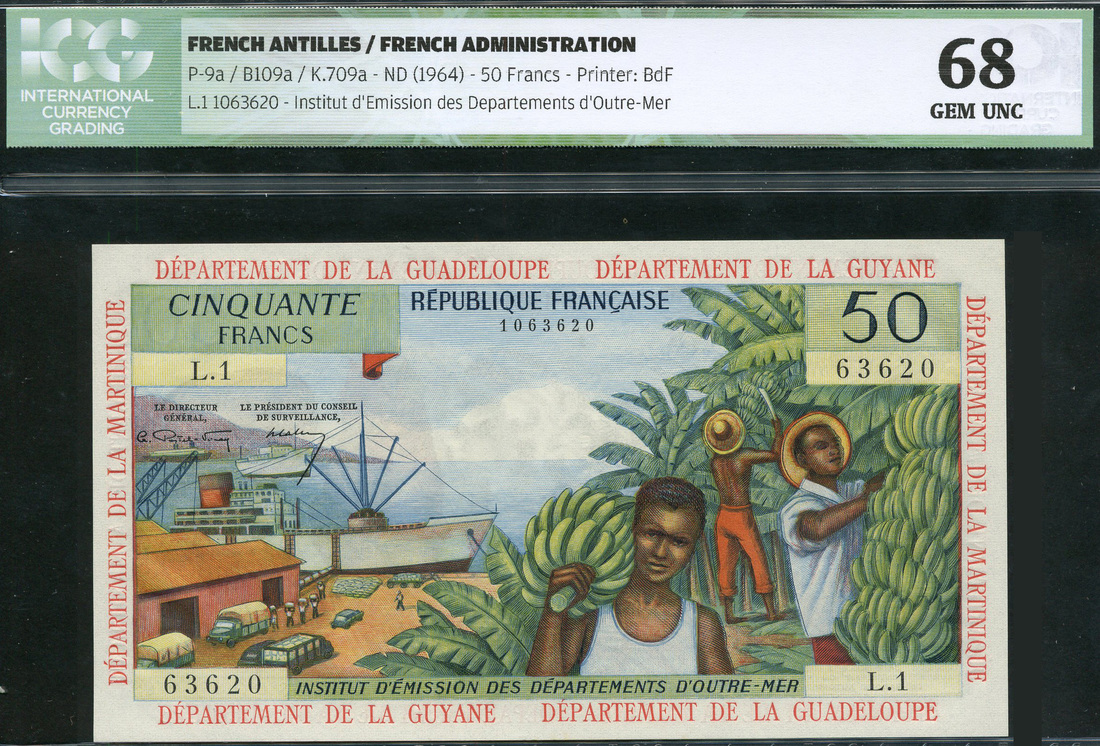 (x) Institut d'Emission des Departements d'Outre-Mer, French Antilles, 50 francs, ND (1966), serial number L.1 63620, blue and multicoloured, banana harvesting and dock loading in field, Postel-Vinay and Calvet signatures, red DEPARTEMENT DE LA MARTINIQUE/GUADELOUPE/GUYANE in borders, reverse multicoloured, allegorical couple and coastline in field