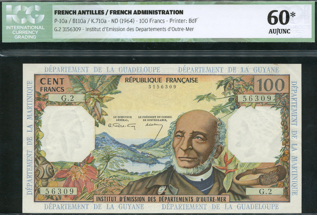 (x) Institut d'Emission des Departements d'Outre-Mer, French Antilles, 100 francs, 'Schoelcher', ND (1964), serial number G.2 56309, blue and multicoloured, Victor Schoelcher at right, landscape in background, banana harvesting and dock loading in field, Postel-Vinay and Calvet signatures, blue DEPARTEMENT DE LA MARTINIQUE/GUADELOUPE/GUYANE in borders, reverse multicoloured, Victor Schoelcher and allegorical scenes and arms
