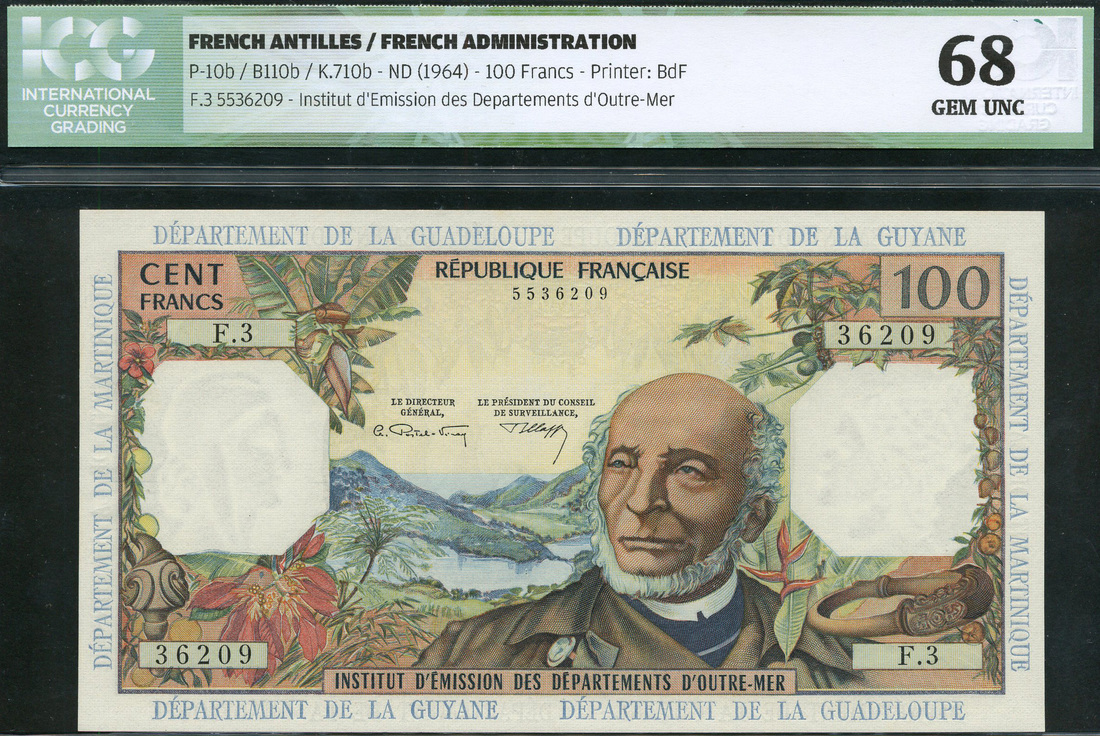 (x) Institut d'Emission des Departements d'Outre-Mer, French Antilles, 100 francs, 'Schoelcher', ND (1967), serial number F.3 36209, blue and multicoloured, Victor Schoelcher at right, landscape in background, banana harvesting and dock loading in field, Postel-Vinay and Clappier signatures, blue DEPARTEMENT DE LA MARTINIQUE/GUADELOUPE/GUYANE in borders, reverse multicoloured, Victor Schoelcher and allegorical scenes and arms