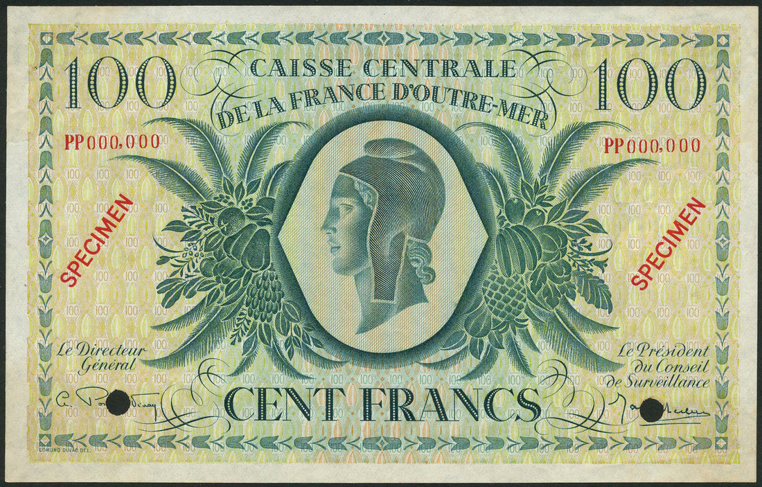 Caisse Centrale de la France Libre, specimen 100 francs, law of 1941, red serial number PF 000001 - 2000000, green, Marianne at centre, reverse green, value in top left and right, allegorical symbols of trade and commerce, reverse green, red SPECIMEN overprint, hole punched