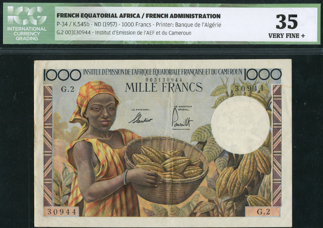 (x) French Equatorial African States, 1000 francs, ND (1957), serial number G.2 30944, pale blue and multicoloured, girl with basket of cocoa pods at left, cocoa plant at right, value top left and right, signatures of Panouillot and Gautier, reverse multicoloured, man with cotton plant, value top left and right