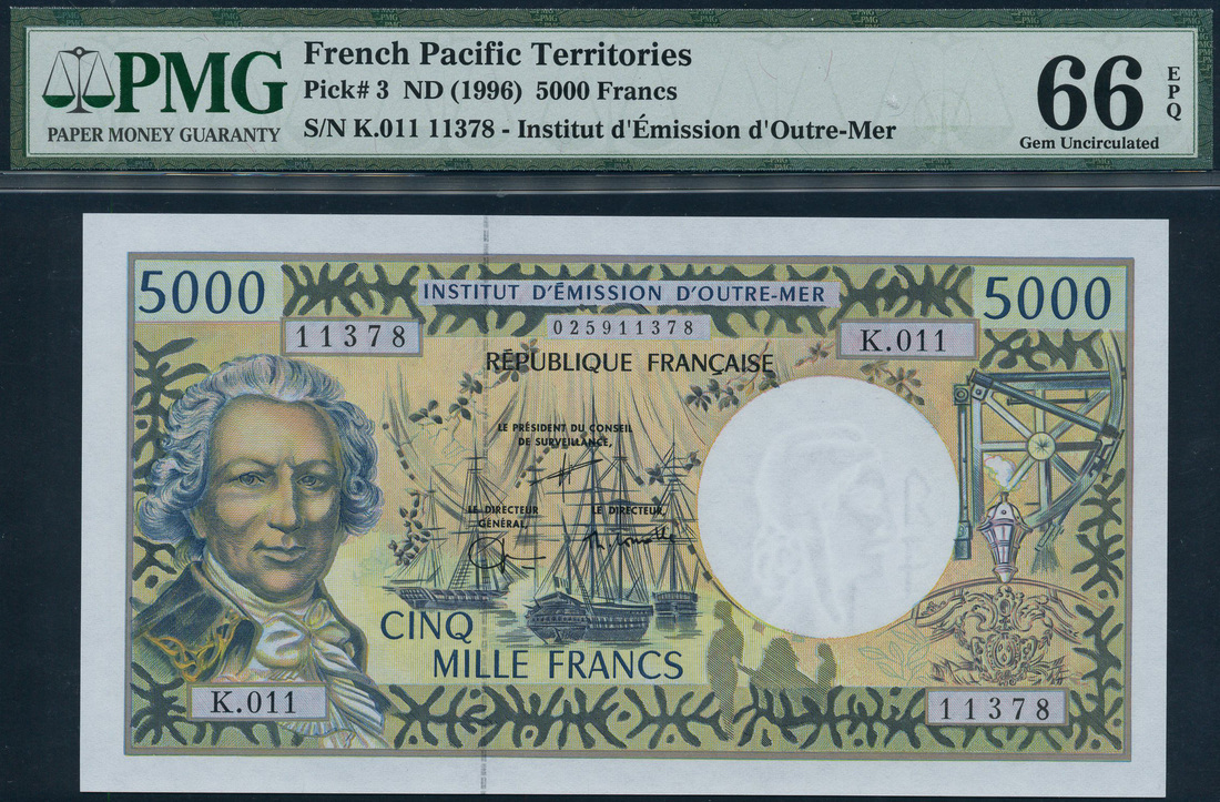 (x) French Pacific Territories, 5000 francs, ND (1996), serial number K.011 025911378, green and blue, de Bougainville at left, ships at centre
