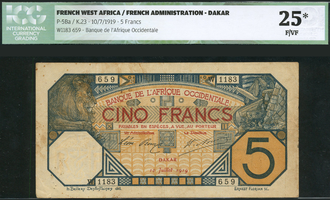 (x) Banque de l'Afrique Occidentale, French West Africa, 5 francs, Dakar, 10 July 1919, serial number 659-1183, blue and orange, value in red top centre, lion and allegorical symbols at left and right, Prom and Nouvion signatures, reverse blue-green and white, text