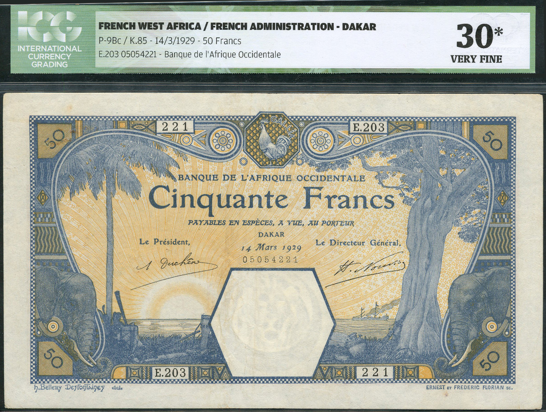 (x) Banque de l'Afrique Occidentale, French West Africa, 50 francs, Dakar, 14 March 1929, serial number E.203 221, blue and orange-yellow, elephant, palm tree and allegorical symbols, Duchene and Nouvion signatures, reverse orange-pink, Arabic text
