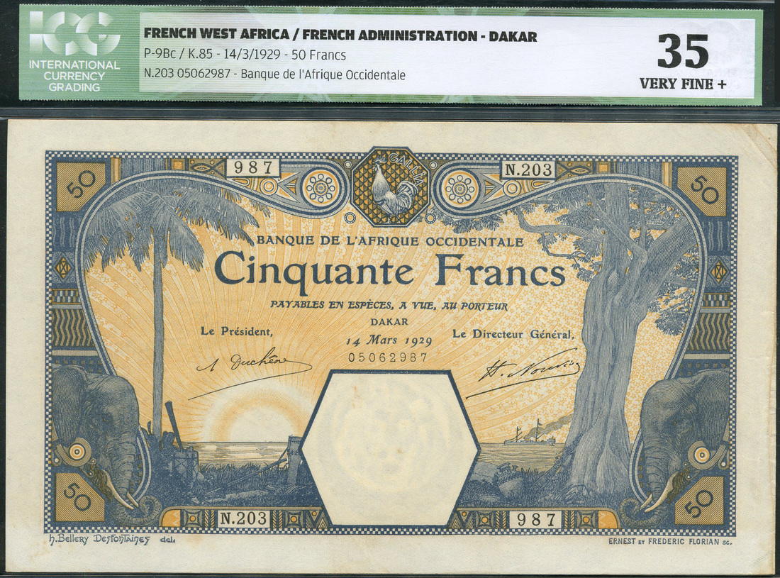 (x) Banque de l'Afrique Occidentale, French West Africa, 50 francs, Dakar, 14 March 1929, serial number N.303 987, blue and orange-yellow, elephant, palm tree and allegorical symbols, Duchene and Nouvion signatures, reverse orange-pink, Arabic text