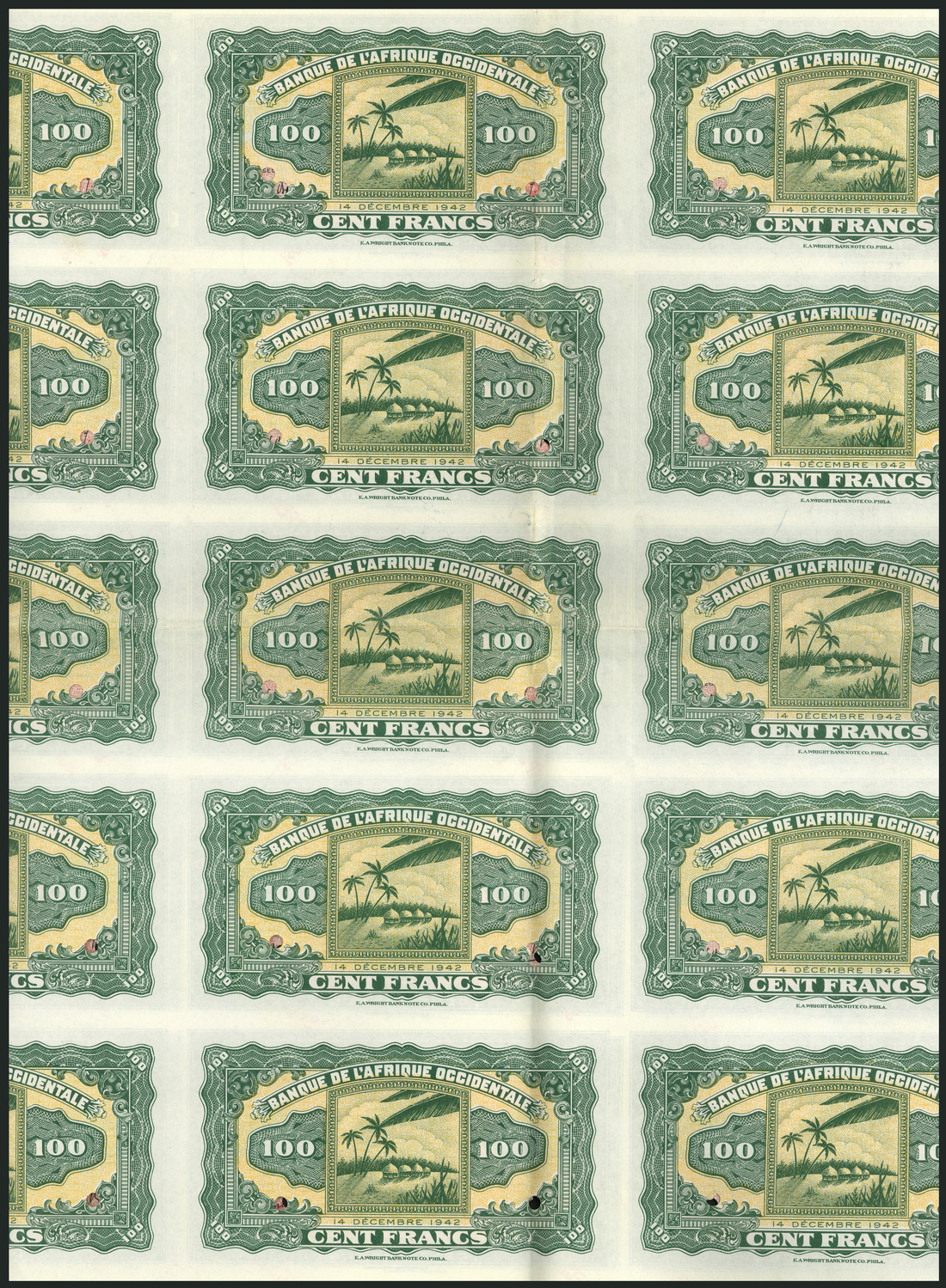 (†) Banque de l'Afrique Occidentale, French West Africa, a printer's archival sheet of 36 uniface copies of 5 Francs, 14 December 1942, reddish-purple on pale blue underprint, reverse only, value in guilloche at centre with acanthus scrolls in borders