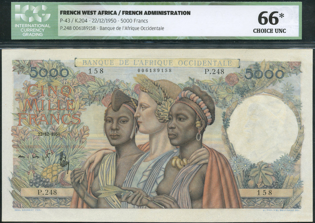 (x) Banque de l'Afrique Occidentale, French West Africa, 5000 francs, 22 December 1950, serial number P.248-158, multicoloured, three women at centre, France (Marianne) and Colonies, floral border in background, signatures of De Coppet and Poilay signatures at left, reverse pale blue and multicoloured, man and woman with stringed instrument and palm frond