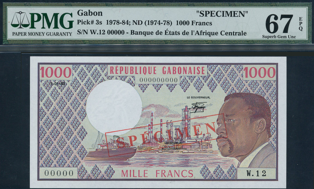 (x) Banque des Etats de l’Afrique Centrale, Republique Gabonaise, specimen 1000 francs, ND (1983), serial number W.12 00000, blue and multicoloured, President Bongo at right, ship and refinery at centre, value in red top left and right, signatures of Joudiou and Renombo, reverse blue, carving at left and right, red SPECIMEN overprint