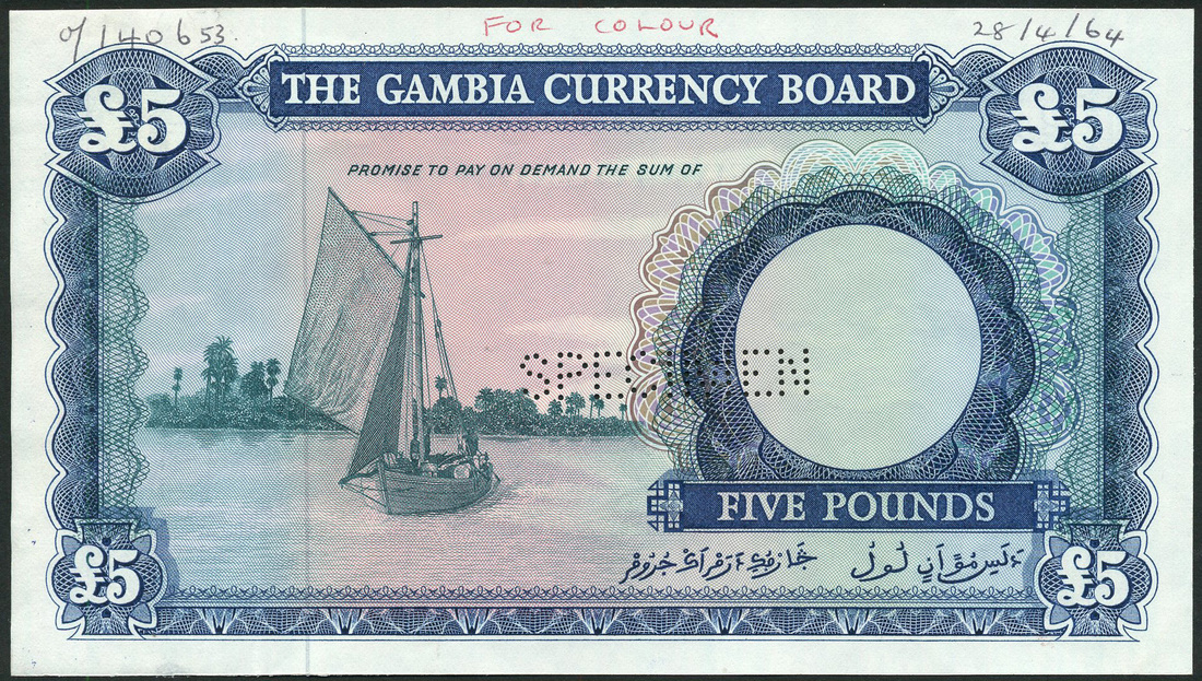 (†) Gambia Currency Board, a group of progressive proofs for the £5, ND (1964). comprising 1. Progressive proof with underprint only on obverse, complete reverse; 2. Progressive proof without sailing ship on obverse, complete reverse; and 3. Complete proof, no serial numbers, blue and multicoloured, sailing ship on The Gambia River at left, reverse three men operating a milling machine, all perforated SPECIMEN