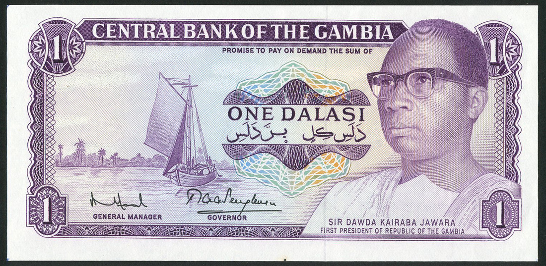 (†) Central Bank of The Gambia, obverse uniface progressive proofs (3) for 1 Dalasi, ND (ca 1982), all signed by Ahaji Abdoulie Antouman Faal and Thomas Gregory George Senghore, comprising 1. green central guilloche on lilac and green underprint; 2. blue and ochre central guilloche on olive-green and yellow underprint; 3. blue, green and ochre central guilloche on lilac, green, blue and yellow underprint; also complete specimen proof 1 Dalasi, ND (ca 1982), no serial numbers, signatures of Faal as General Manager and Senghore as Governor, purple and multicoloured, President Dawda Kairaba Jawara at right, sailing boat at left, reverse workers harvesting rice