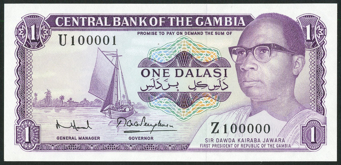(†) Central Bank of The Gambia, specimen 1 Dalasi (4) ND (ca1982), all signed by Ahaji Abdoulie Antouman Faal as General Manager and Thomas Gregory George Senghore as Governor, all purple and multicoloured, President Dawda Kairaba Jawara at right, sailing boat at left, reverse workers harvesting rice, the first a specimen proof, no serial numbers; the second serial number 000000; the third serial number U 000000, overprinted SPECIMEN diagonally in red on obverse and reverse; the fourth a printer's archival specimen serial number run U 100001 to Z 100000