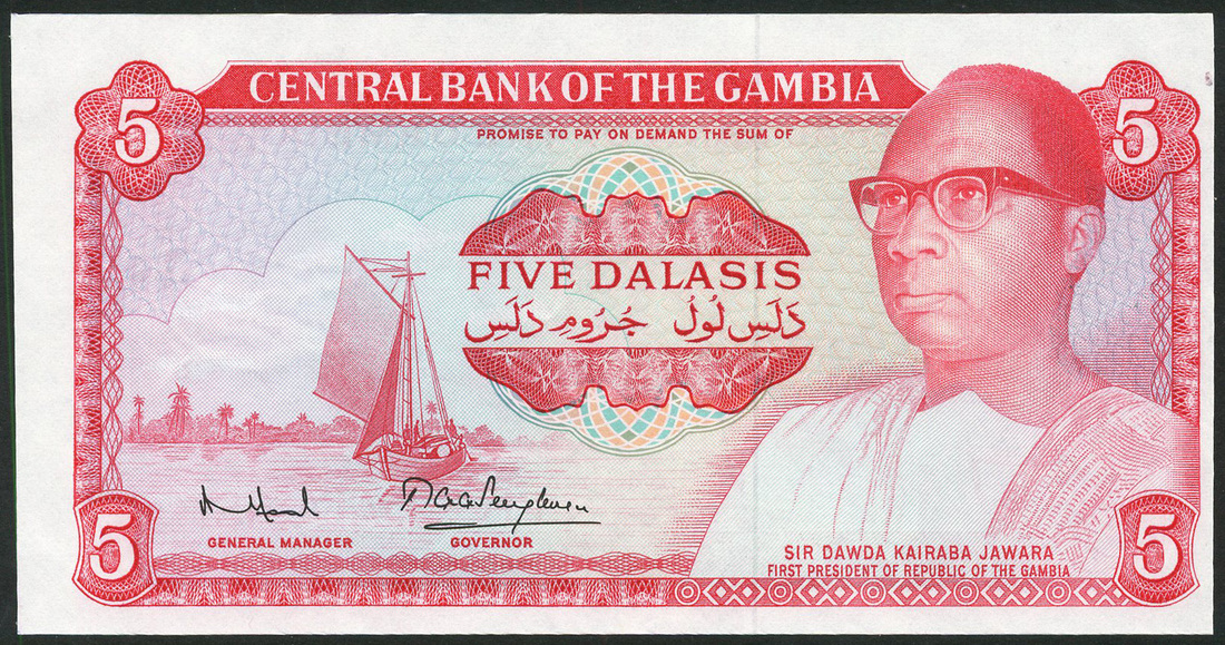 (†) Central Bank of The Gambia, progressive proofs (6) for 5 Dalasis, ND (ca 1982), comprising 1. obverse blue and ochre central guilloche on blue and ochre underprint; 2. obverse blue-green central guilloche on blue-green and lilac underprint; 3. obverse blue and ochre central guilloche on lilac, green, blue and yellow underprint; 4. and 5. obverse as 3 but with complete reverse; 6. obverse as 3. but signed by Ahaji Abdoulie Antouman Faal and Thomas Gregory George Senghore, complete reverse; also complete specimen proof 5 Dalasis, ND (ca 1982), no serial numbers, signatures of Faal as General Manager and Senghore as Governor, red and multicoloured, President Dawda Kairaba Jawara at right, sailing boat at left, reverse men stacking sacks