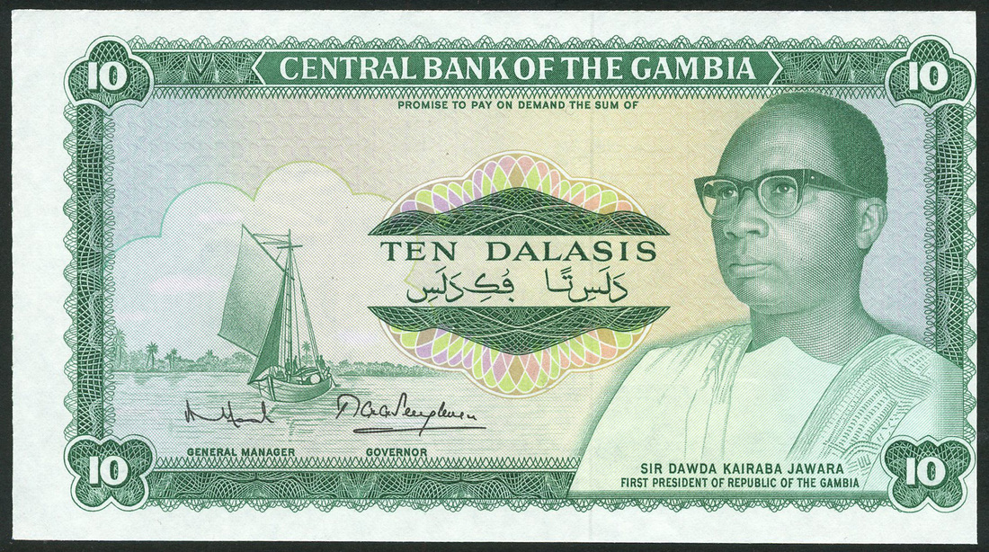 (†) Central Bank of The Gambia, progressive proofs for 10 Dalasis, ND (ca 1982), comprising 1. and 2, obverse green central guilloche on pale green and blue-green underprint; 3. obverse as 1. and 2. but signed Ahaji Abdoulie Antouman Faal and Thomas Gregory George Senghore; 4. obverse purple and orange central guilloche on lilac and orange underprint, signed by Faal and Senghore; 5. and 6. obverse purple and green central guilloche on blue and green underprint, signed by Faal and Senghore, reverse complete; also complete specimen proof 10 Dalasis, ND (ca 1982), no serial numbers, signatures of Faal as General Manager and Senghore as Governor, green and multicoloured, President Dawda Kairaba Jawara at right, sailing boat at left, reverse three men in boat casting net