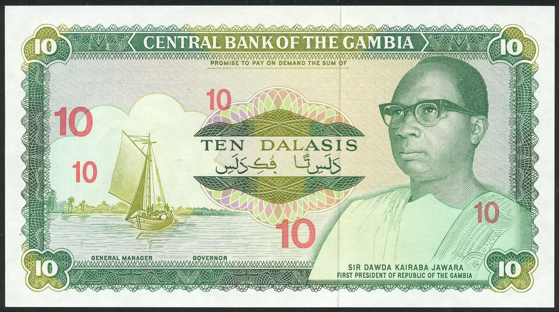 (†) Central Bank of The Gambia, specimen proof 10 Dalasis ND (ca1986), no serial numbers, no signatures, green and multicoloured, President Dawda Kairaba Jawara at right, sailing boat at left, reverse three men in a boat casting a net, overprinted in red with two large and three small figure '10's on obverse