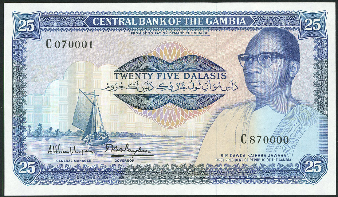 (†) Central Bank of The Gambia, a group of specimen 25 Dalasis (3), ND (ca 1986), the first serial number C 000000, overprinted SPECIMEN diagonally in red on obverse and reverse, SPECIMEN No 1 in lower left margin; the second a printer's archival specimen, serial number run C 070001 to C 870000, both signature Humphreys and Senghore; the third a printer's archival specimen, serial number run C 870001 to E 870000, signature Fillingham and Jagne, all blue and multicoloured, President Dawda Kairaba Jawara at right, sailing boat at left, reverse three men operating a milling machine