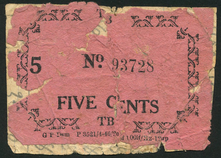 Tabora, German East Africa, prisoner of war camp money (Camp No 1) for 5 cents, serial number 93728, black text on pink paper