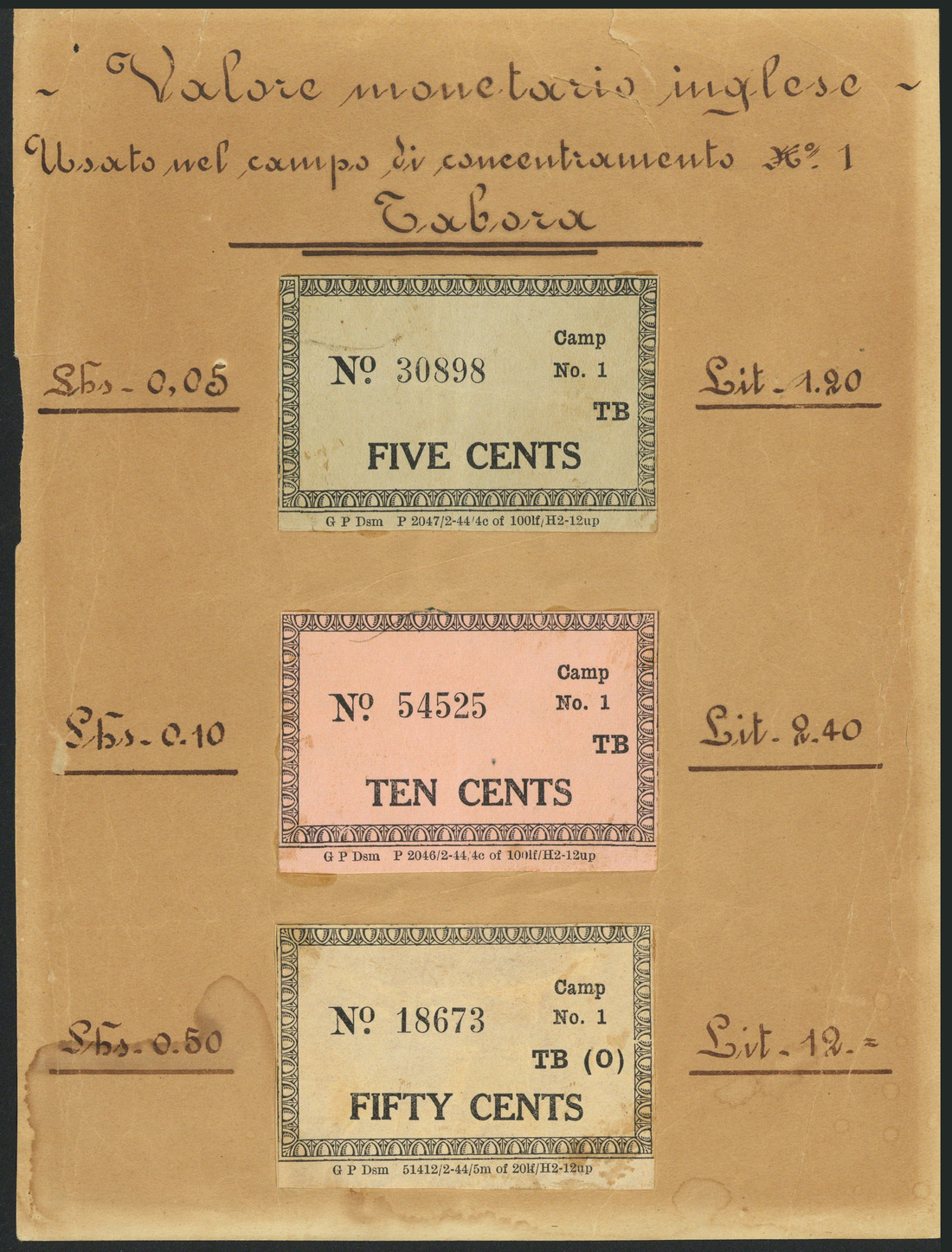Tabora, German East Africa, a set of prisoner of war camp money (Camp No 1), 5 cents, grey, 10 cents, pink and 50 cents, grey-brown, all on old paper with title 'Valore Monetaio inglese usato nel campo di concentramento No.1'