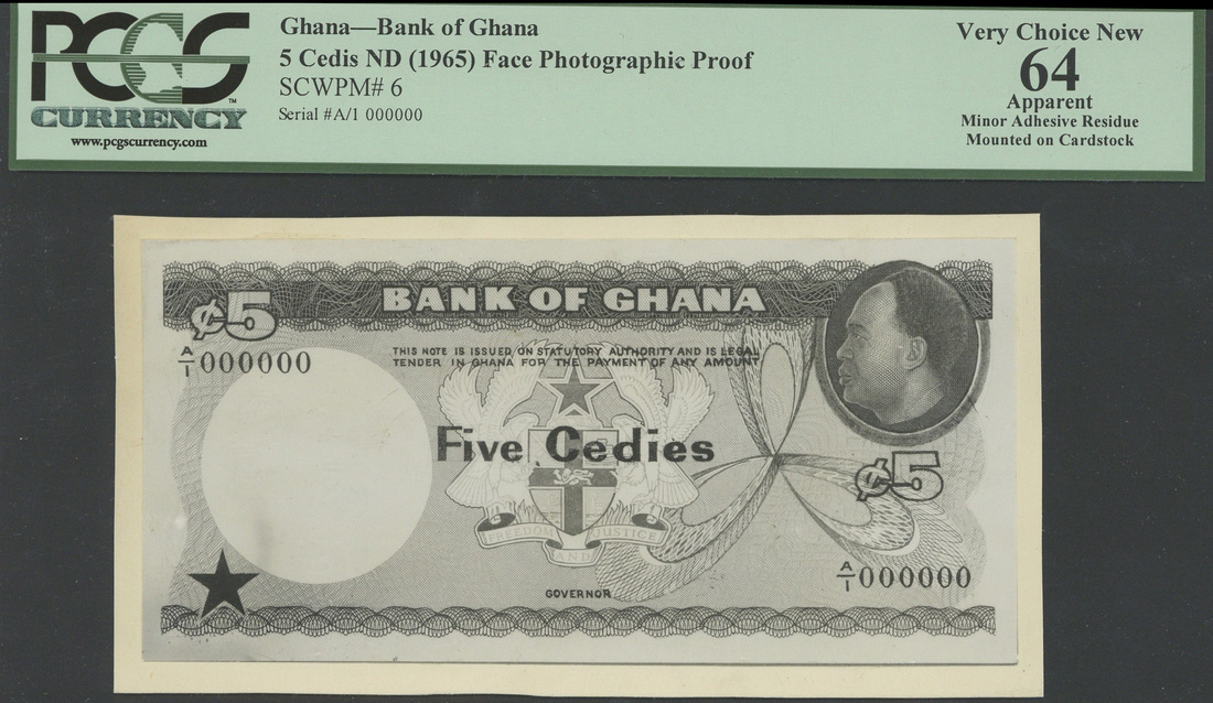 (x) Bank of Ghana, group of black and white archival photographs, including obverse and reverse of 1, 2, 5, 10, 20 and 50 ghana dollars, 1962, 5 cedis, 1965 and 1 cedis (2) 1966, backed on card, the first five pairs similar to the issued design, but in a denomination not used, and the others very different from those produced