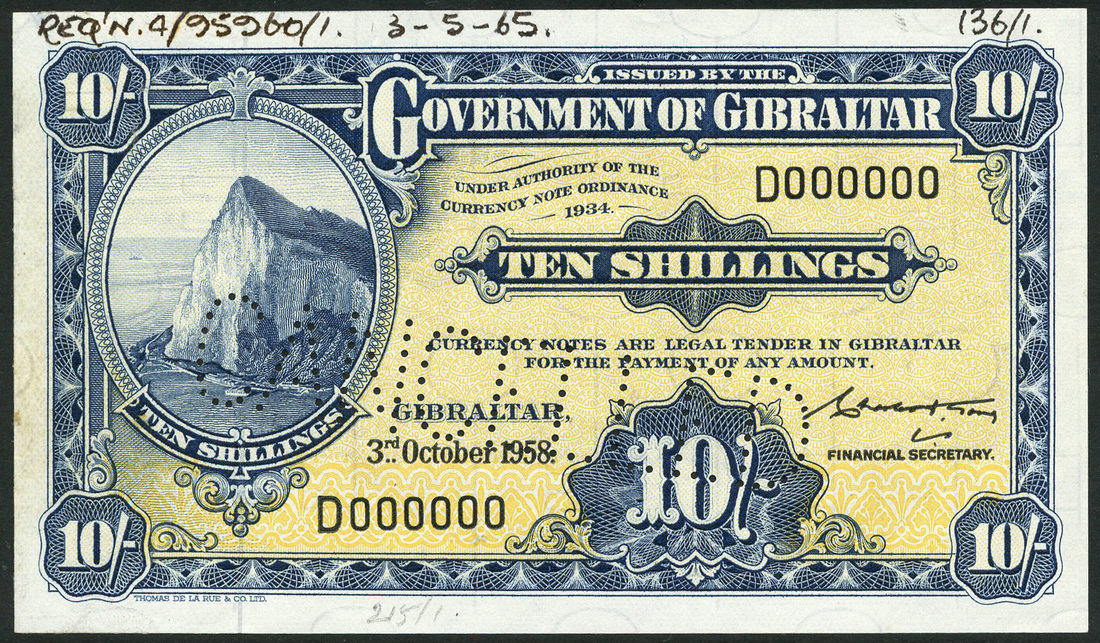 (†) Government of Gibraltar, specimen 10 shillings, 3 October 1958, serial number D000000, blue on yellow underprint, Rock of Gibraltar at left, value at low right and each corner, reverse blue arms at centre, perforated CANCELLED