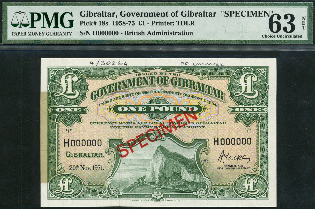 Government of Gibraltar, specimen £1, 20 November 1971, serial number H000000, green on light orange, bank title top centre, value in ornate tablets in each corner and at top centre, Rock of Gibraltar at centre, reverse, coat of arms flanked by value