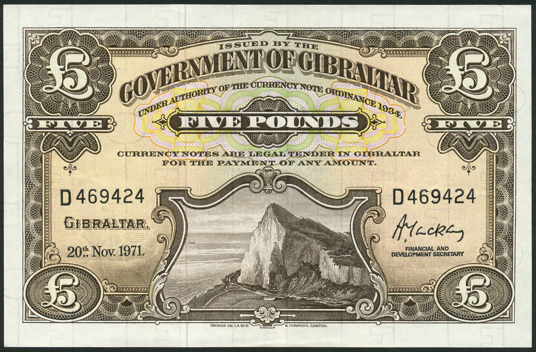 Government of Gibraltar, £1, 1975, prefix H, green, Collings signature, also £5, 1971, prefix D, brown, MacKay signature, brown, both the Rock at right, value at each corner