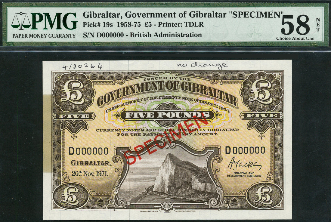 Government of Gibraltar, specimen £5, 20 November 1971, serial number D000000, brown on light orange, bank title top centre, value in ornate tablets in each corner and at top centre, Rock of Gibraltar at centre, reverse, coat of arms flanked by value