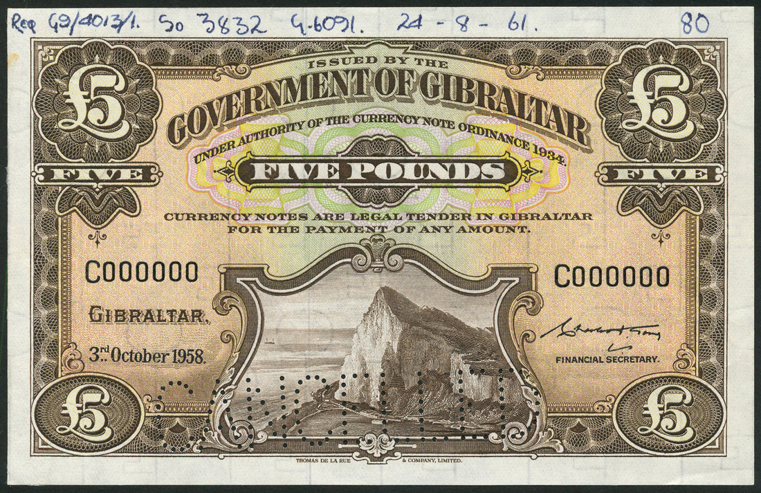 (†) Government of Gibraltar, specimen £5, 3 October 1958, serial number C000000, brown on multicolour underprint, Rock of Gibraltar at left, value at each corner, reverse brown, arms at centre, perforated CANCELLED