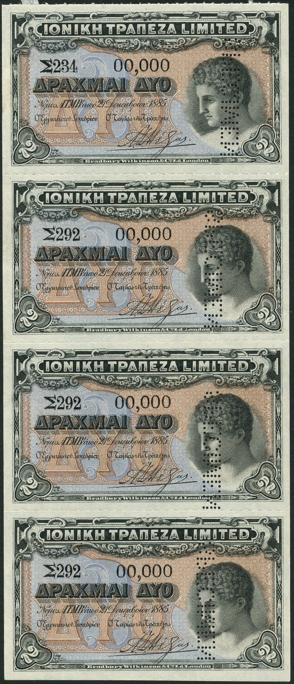 (†) Ionian Bank Limited, Greece, a vertical format sheet of four specimen 2 drachmai, 21 December 1885, series S 176, blue, orange and black, Alexander III (the Great) at left, Athena at right, reverse brown, arms at centre