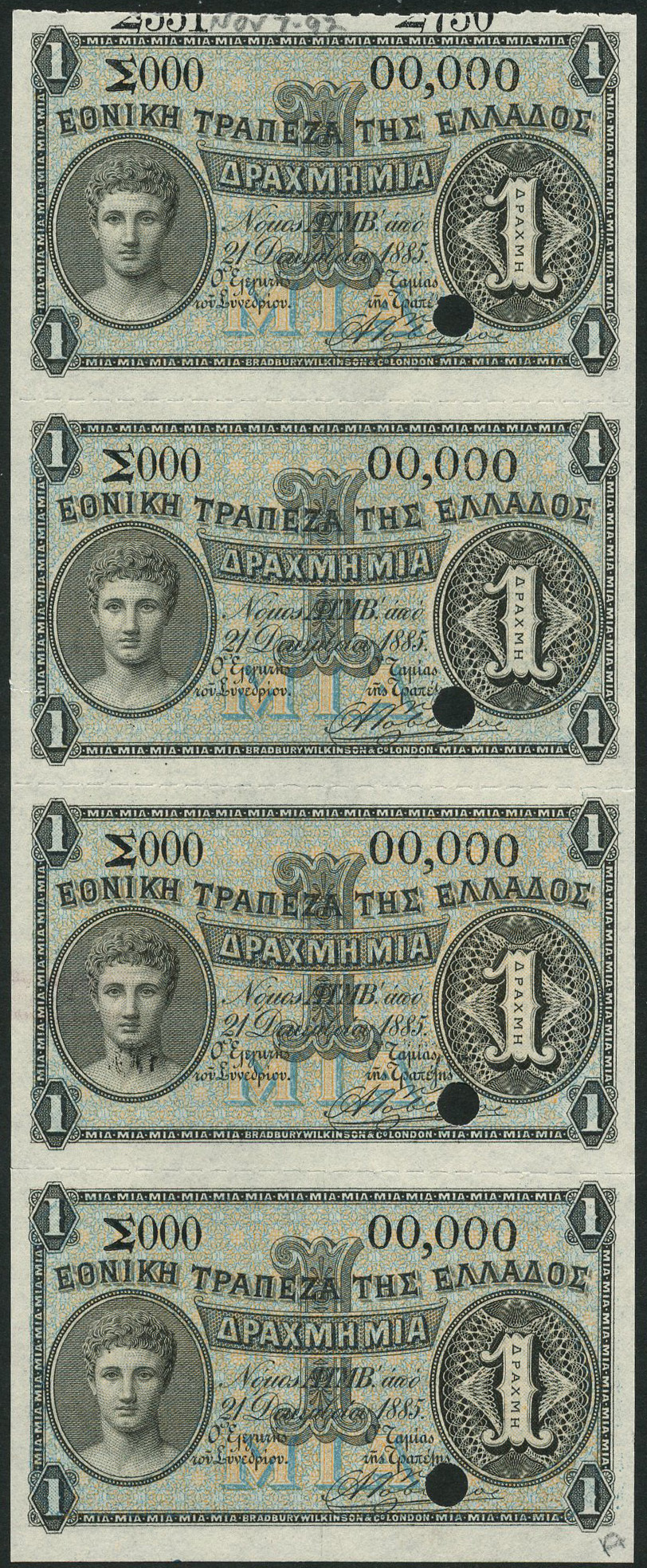(†) National Bank of Greece, a sheet of 4 x 1 drachmai, 21 December 1885, black, pale blue and orange, head of Hermes at left, reverse blue, arms and value