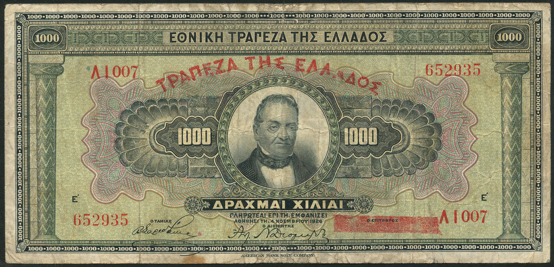 Bank of Greece, a group comprising 1000 drachmai (3), 1926, prefixes KY039, ^Z032, ^I007, all with red overprint over signature, 5000 drachmai, 1932, prefixes AI012, AH033, 100,000 drachmai, 1944, green, 500,000 drachmai, 1944, brown