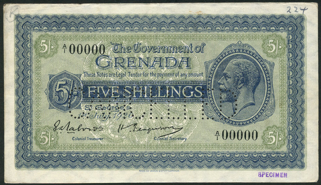 (†) Government of Grenada, specimen 5 shillings, 1 July 1920, serial number A/1 00000, dark blue on green underprint, George V at right, value in tablet at centre, and each corner, reverse brown, sailing ship at centre, value at left and right, small purple SPECIMEN overprint and large CANCELLED perforation