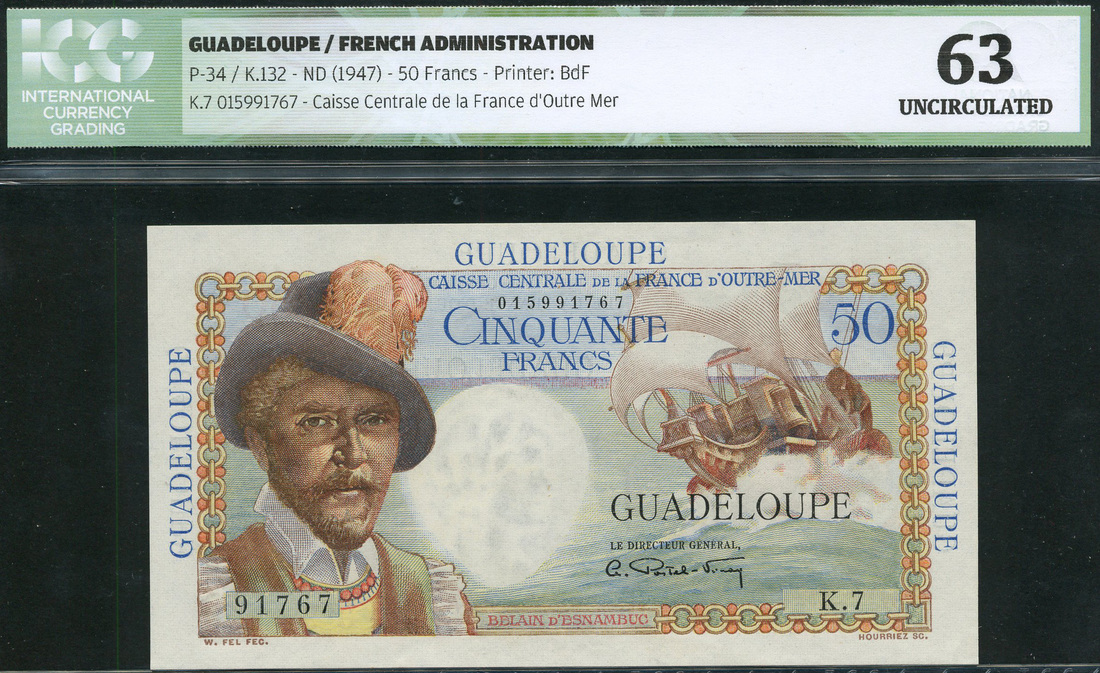 (x) Caisse Centrale de la France d'Outre-Mer, Guadeloupe, 50 francs, ND (1947-1949), serial number K.7 91767, multicoloured, value in blue, d'Esnambuc at left, galleon at right, Postel-Vinay signature, blue GUADELOUPE in margins, reverse multicoloured, Togolese maiden at left, ethnic building at right