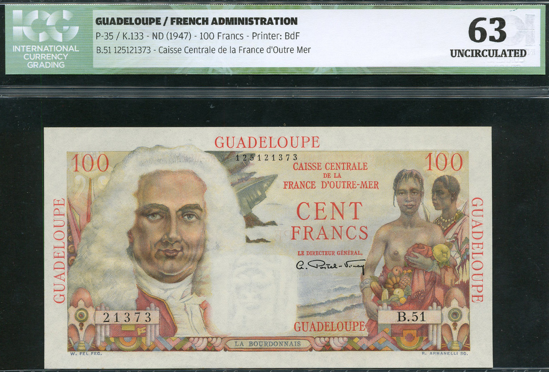 (x) Caisse Centrale de la France d'Outre-Mer, Guadeloupe, 1000 francs, ND (1947-1949), serial number B.51 21373, red and multicoloured, La Bourdonnais at left, natives with fruit at right, Postel-Vinay signature, red GUADELOUPE in margins, reverse multicoloured, maiden and mountains