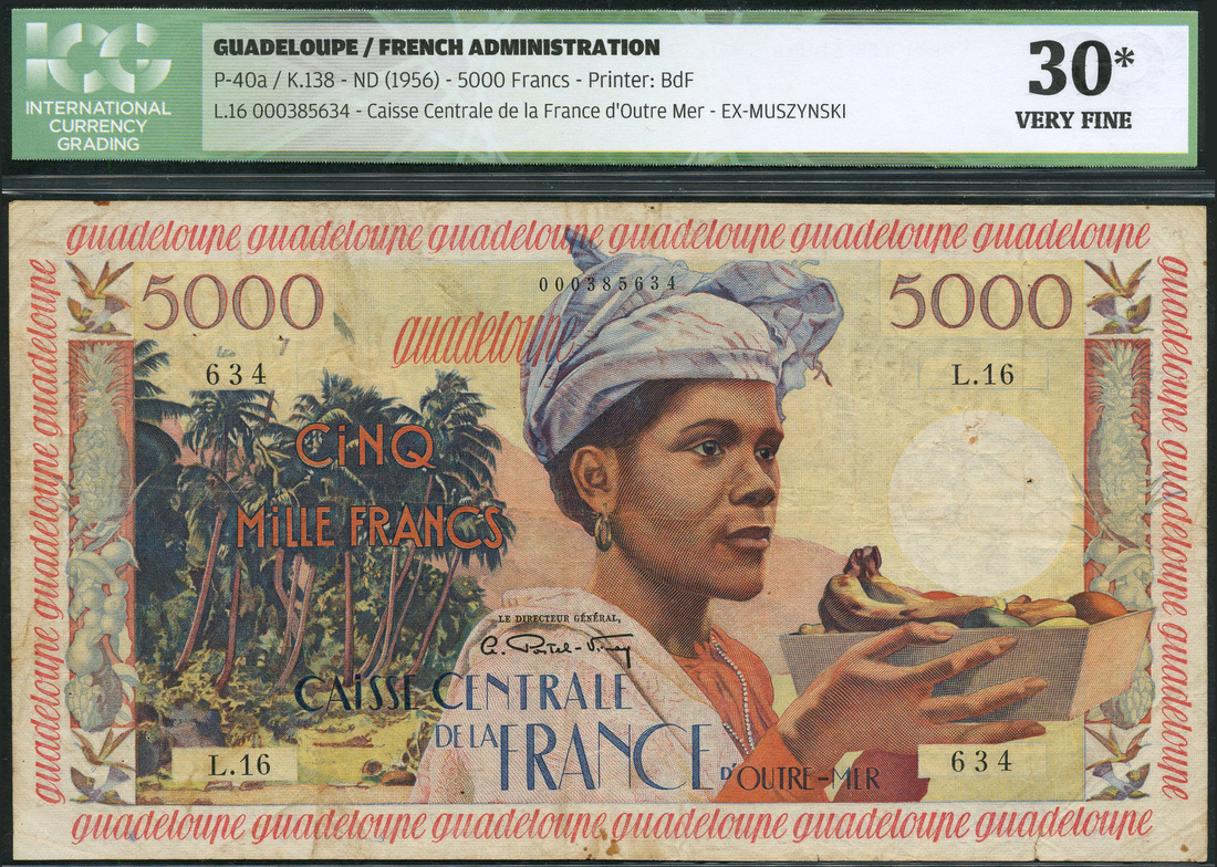 (Pick 40a, Kolsky 138), pinholes, slight glue residue and lightly pressed, in ICG holder number 30, very fine and very rare in any condition. As an additional point of interest Kolsky states that on December 31st 1973 only 4109 notes of Schoelcher or Antilaise or 50NF/5000 francs for all three territories, Guadeloupe, Guyane and Martinique had not been redeemed and thus gives a rarity value of R6.