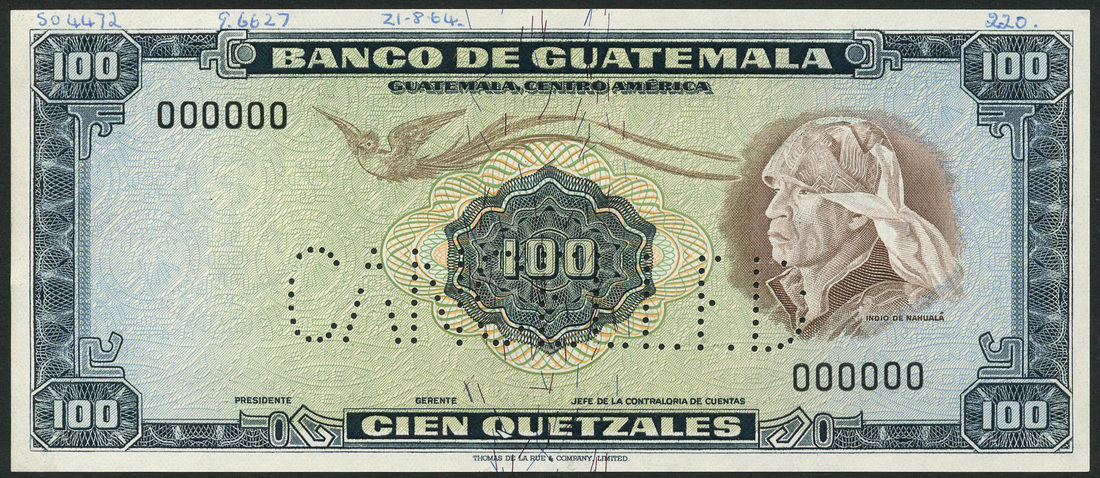 (†) Banco de Guatemala, a full specimen set of the 1964-67 issue, comprising 1/2, 1, 5, 10, 20, 50 and 100 quetzals, all with CANCELLED perforations