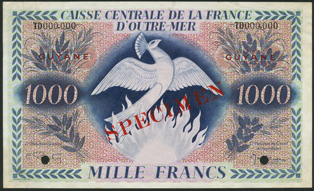 Caisse Centrale de la France d'Outre-Mer, French Guiana, 1000 francs, 2 February 1944, serial number range TD000,000, blue on multicolour underprint, phoenix rising from the flames at centre, value at left and right, red GUYANE overprint at upper left and right, perforated SPECIMEN