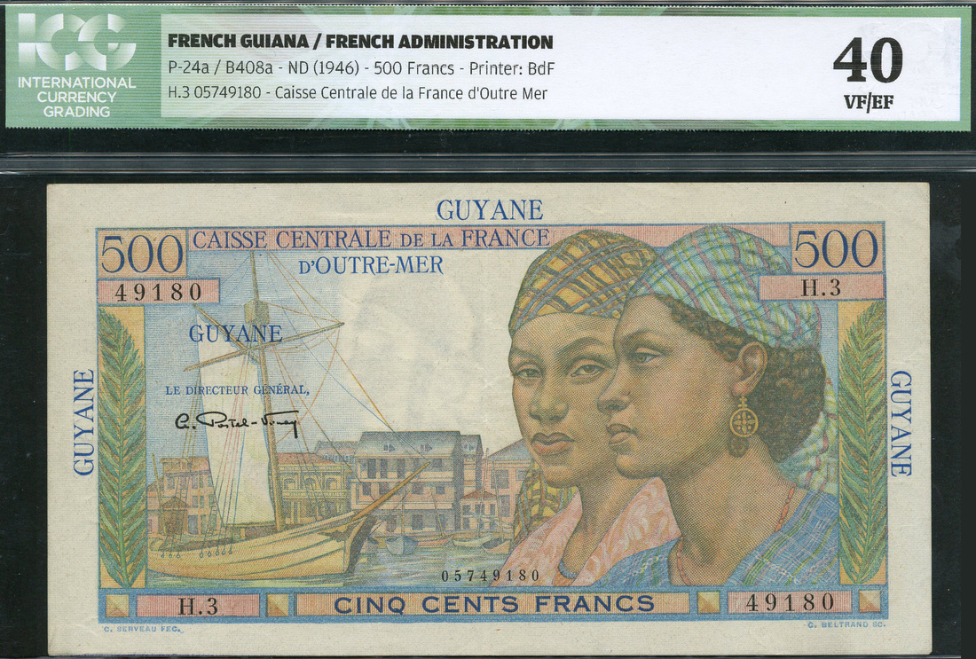 (x) Caisse Centrale de la France d'Outre-Mer, French Guiana, 500 francs, 'Pointe a Pitre', ND (1946-, serial number H.3 49180, blue and multicoloured, two women and the port of Pointe-a Pitre, GUYANE in blue top centre and at left and right in margins, Postel-Vinay signature, reverse multicoloured, bullock carts and sugar cane
