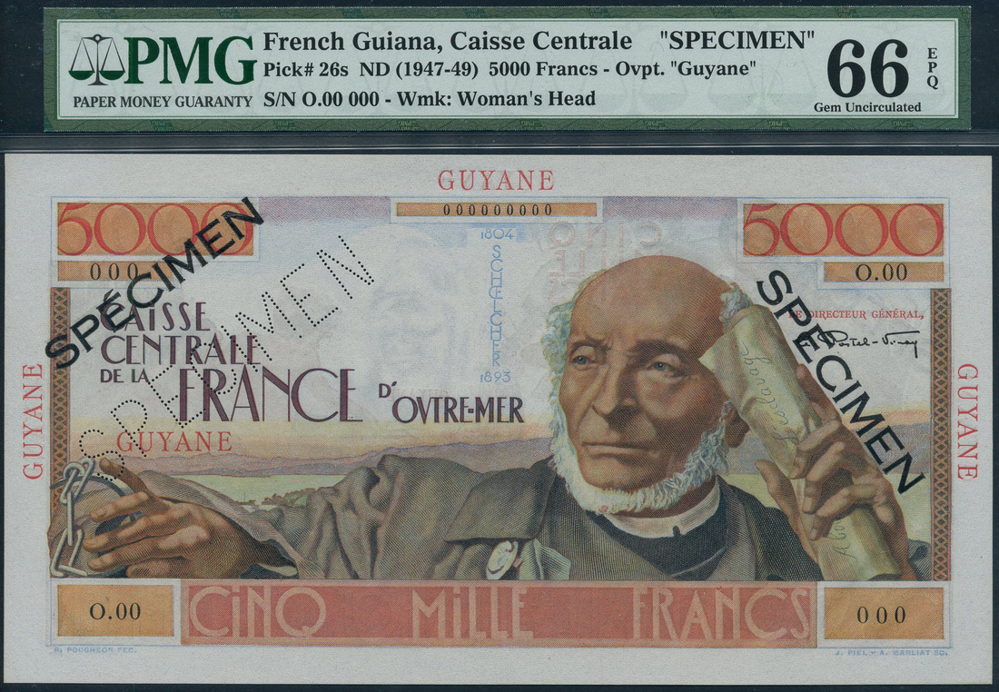 (x) Caisse Centrale de la France d'Outre-Mer, French Guiana, specimen 5000 francs, 'Schoelcher', ND (1952), zero serial numbers, brown and multicoloured, Victor Schoelcher at right, GUYANE in red at top margin and at left and right, Postel-Vinay signature, reverse multicoloured, allegorical local scene, value in red